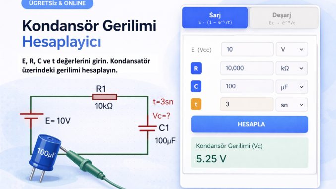 RC devrelerinde kondansatörün belirli bir süre sonra ulaşacağı voltajı hesaplamak için kaynak gerilimi (E), direnç (R), kapasite (C) ve süre (t) değerlerini girin. Hem şarj hem de deşarj hesabı yapabilirsiniz.